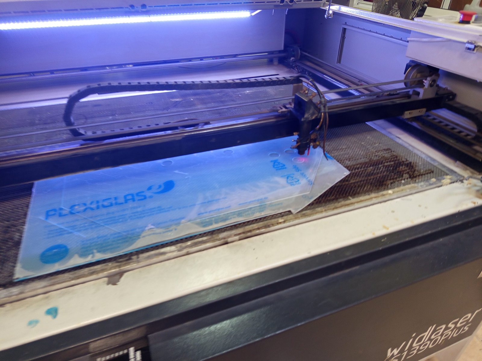 La plantilla se procesó en nuestra máquina de corte láser, obteniendo el metacrilato a medida exacta, con un acabado limpio y profesional. Esta tecnología nos permitió trabajar con tolerancias mínimas, asegurando que el panel encajase perfectamente en la estructura de la máquina.