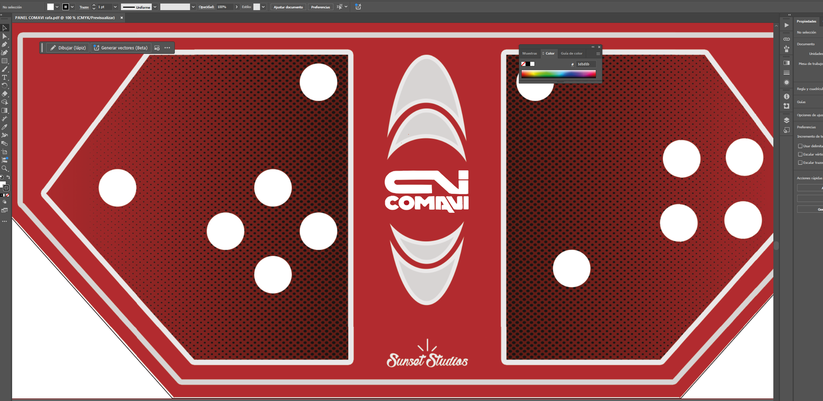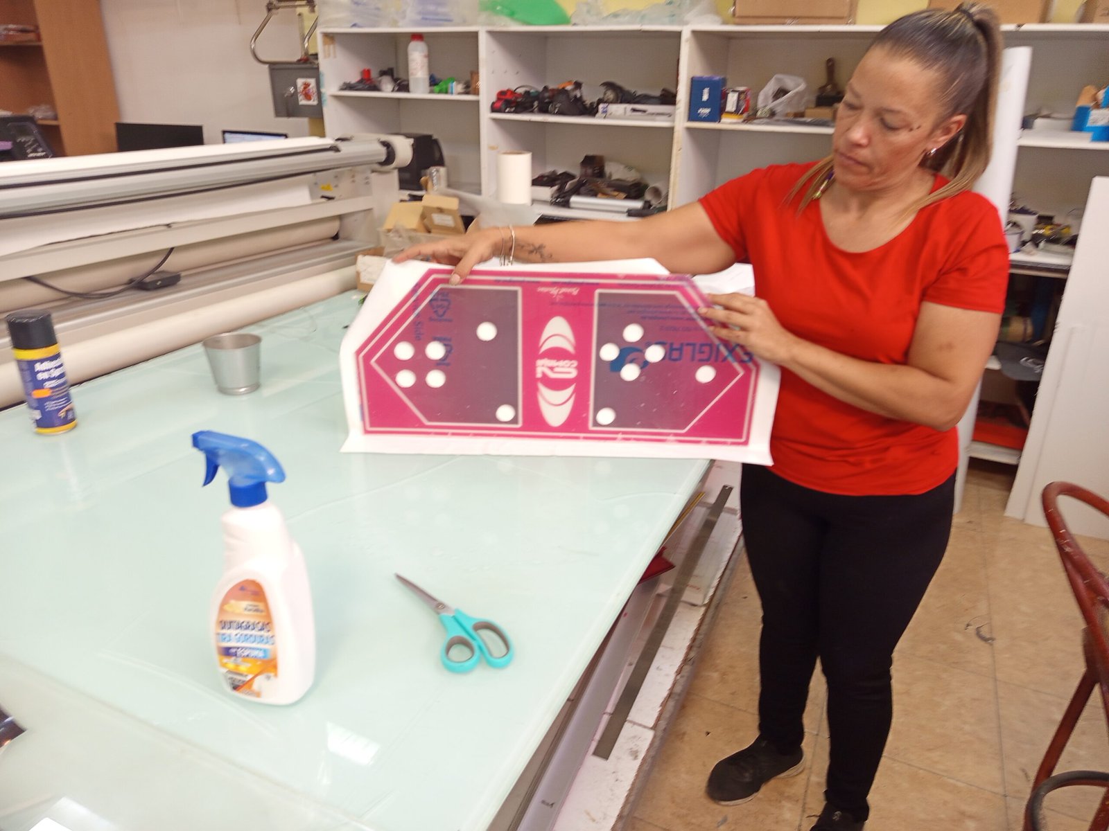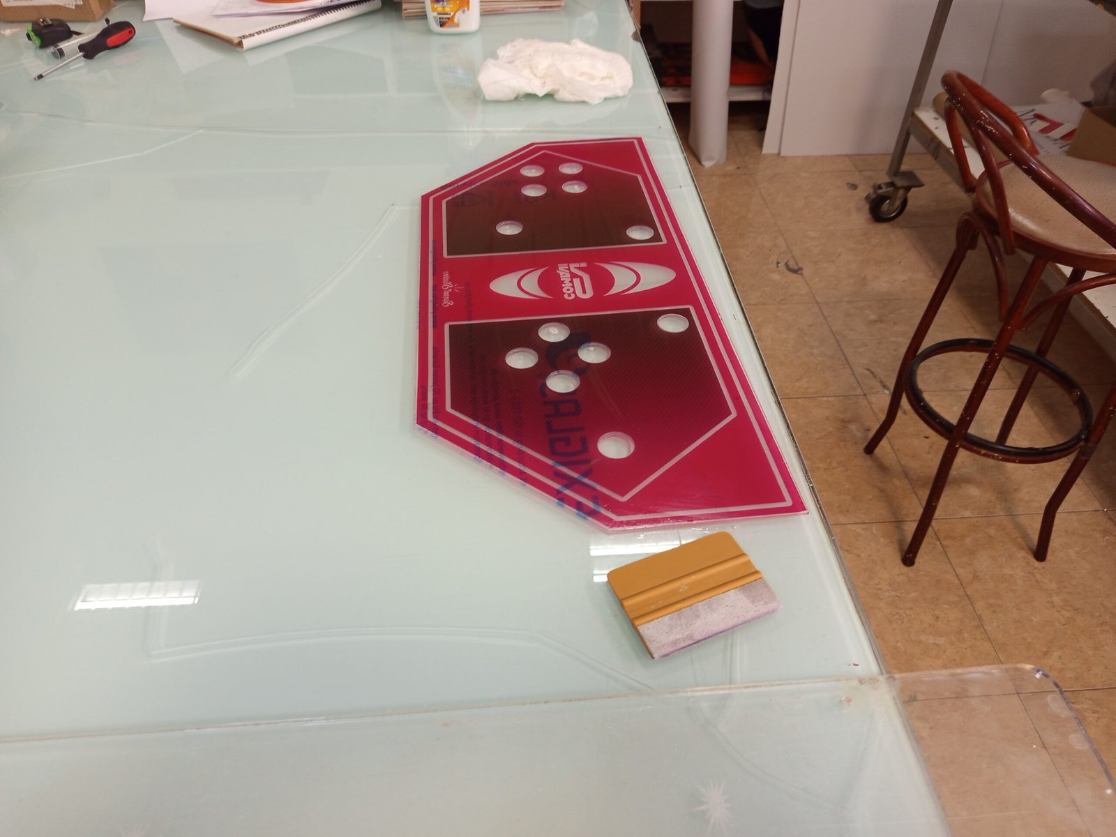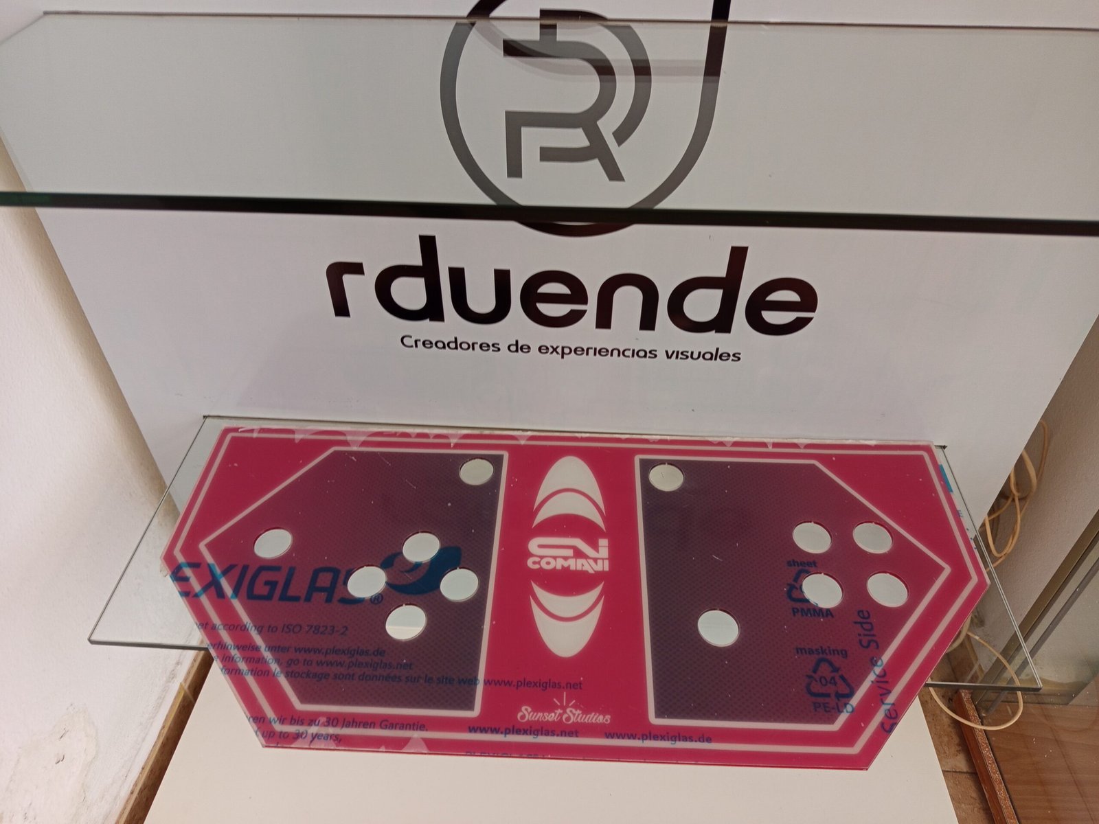El primer paso fue la digitalización del vinilo original y la creación de la plantilla de corte del metacrilato. Este trabajo, realizado en entorno digital, garantizó que el diseño conservara la esencia de la máquina y que cada perforación coincidiera con precisión con la ubicación de botones y joysticks.
