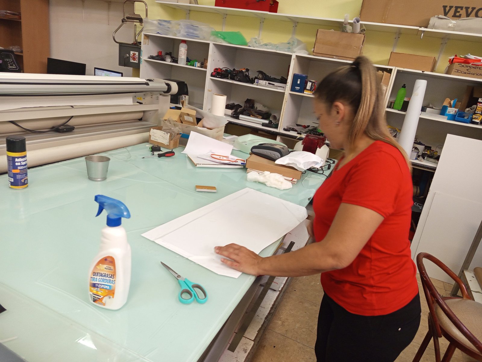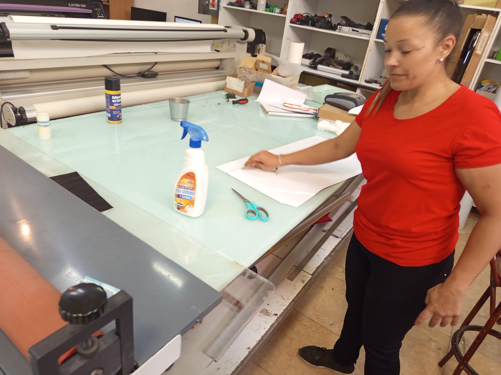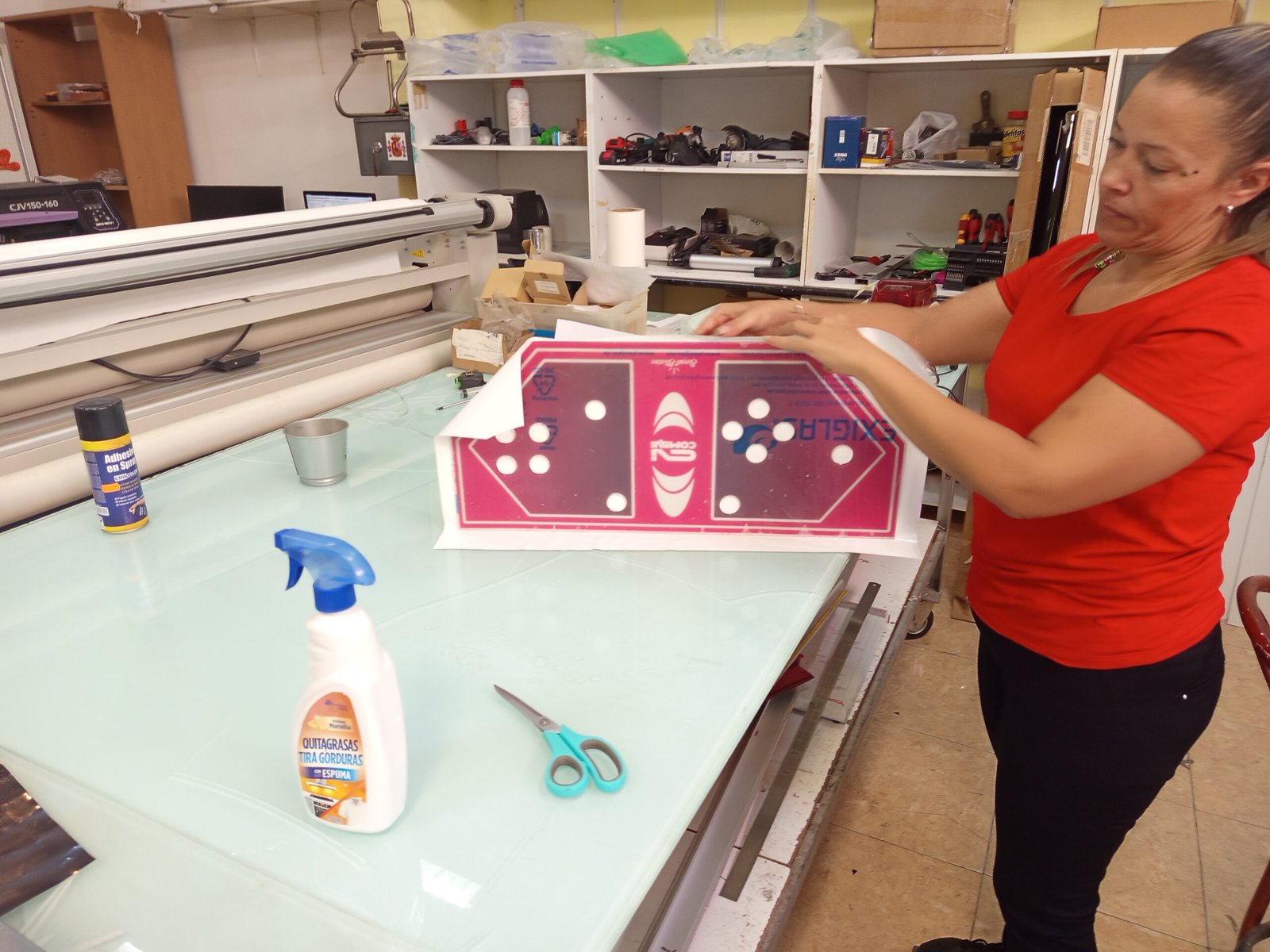 El diseño se imprimió en impresora digital de gran formato, en espejo y sobre material transparente, ya que iba a instalarse en la parte inferior del metacrilato. Este método protege el gráfico del desgaste, manteniendo la viveza de los colores durante mucho más tiempo.